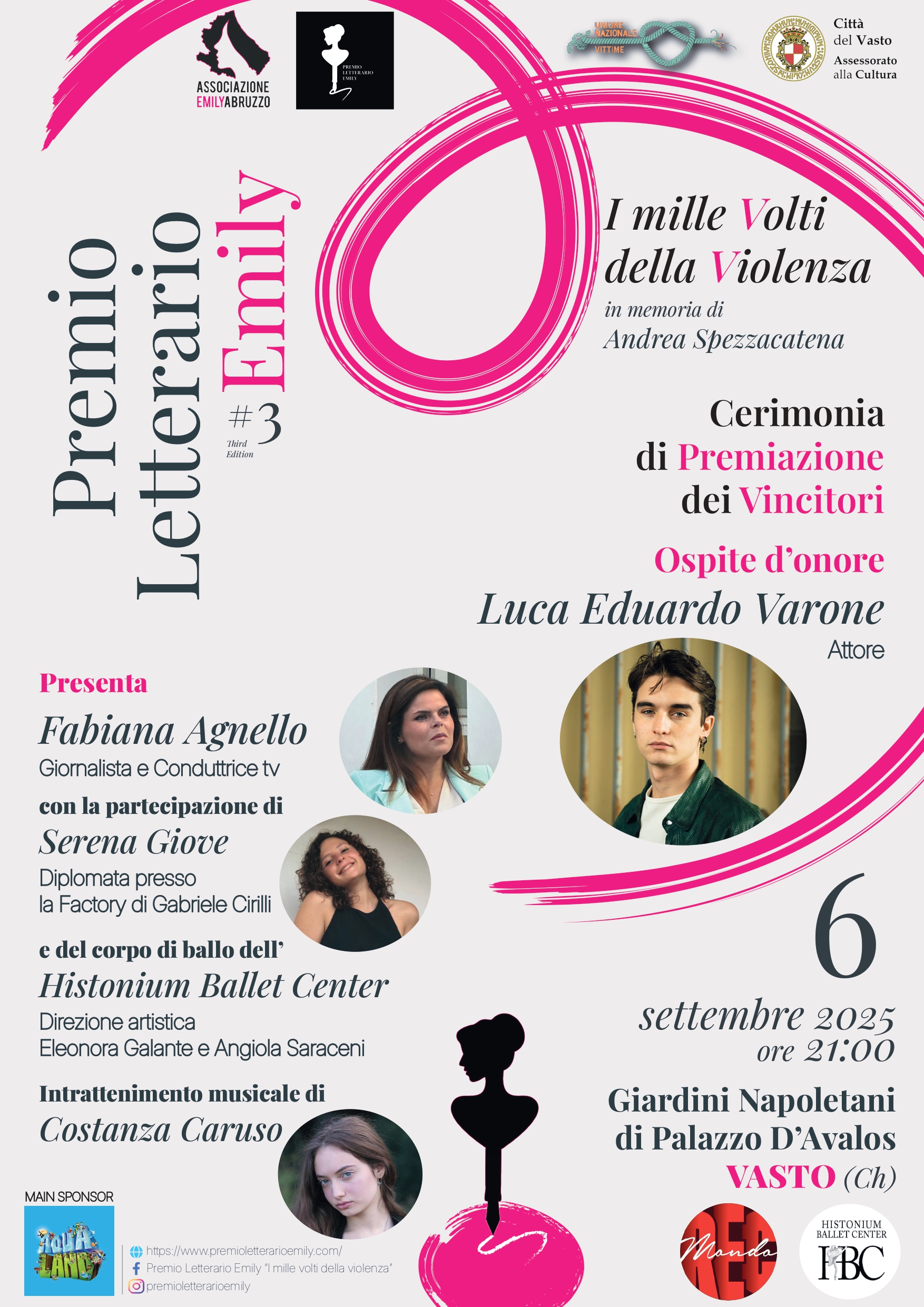 Sabato 6 settembre, a partire dalle ore 21:00, ai Giardini di Palazzo D’Avalos a Vasto si terrà la cerimonia di premiazione dei vincitori della terza edizione del Premio Letterario Emily “I mille volti della violenza”, concorso bandito dall’Associazione Emily Abruzzo con il patrocinio del Comune di Vasto e di Unione Nazionale Vittime (UNaVi). La serata sarà condotta da Fabiana Agnello, giornalista e conduttrice tv nonché membro della giuria tecnica che ha letto e valutato le opere in gara. Ad affiancarla Serena Giove, diplomata presso la Factory di Gabriele Cirilli. L’intera cerimonia sarà inoltre accompagnata dalla musica di Costanza Caruso e dalle coreografie del corpo di ballo dell’Histonium Ballet Center di Vasto. Tra gli ospiti, l’attore di Mare Fuori Luca Eduardo Varone e Teresa Manes, la mamma di Andrea Spezzacatena, il ragazzo dai pantaloni rosa, a cui è dedicata questa edizione del premio letterario. In caso di condizioni meteorologiche avverse, la cerimonia si svolgerà presso il Teatro Rossetti.