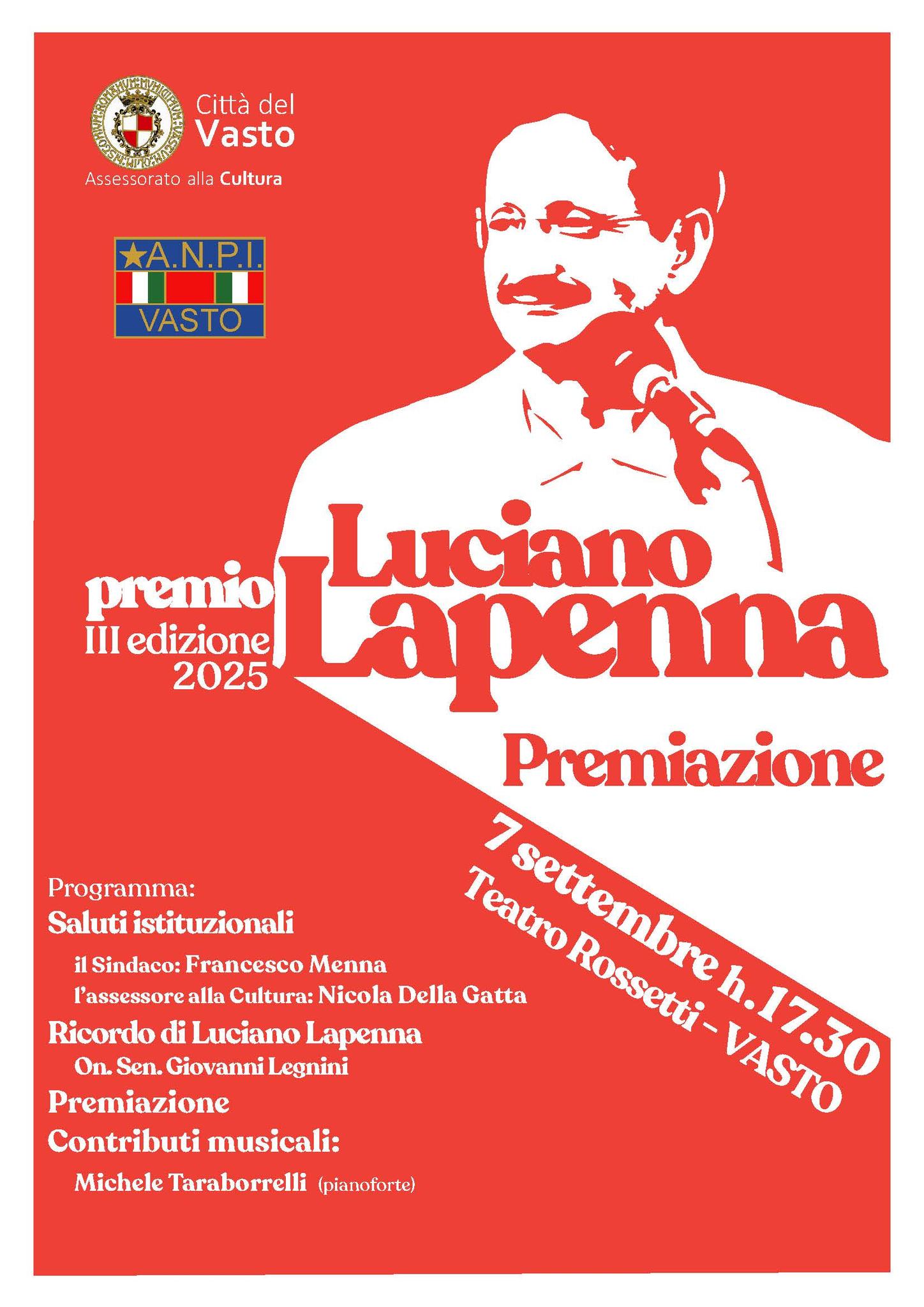 Si svolgerà domenica 7 settembre presso il Teatro Rossetti la cerimonia di premiazione della III edizione del Premio Luciano Lapenna, nato per tenere vivo il senso della politica come servizio alla comunità, che rappresenta il più grande lascito morale dell’ex sindaco di Vasto, e fortemente voluto dagli eredi, dal Comune di Vasto e dalla Sezione A.N.P.I. di Vasto “Vittorio Travaglini” che Luciano Lapenna ha contribuito a fondare.
