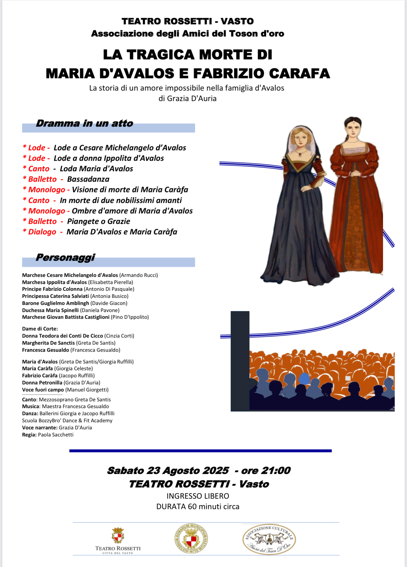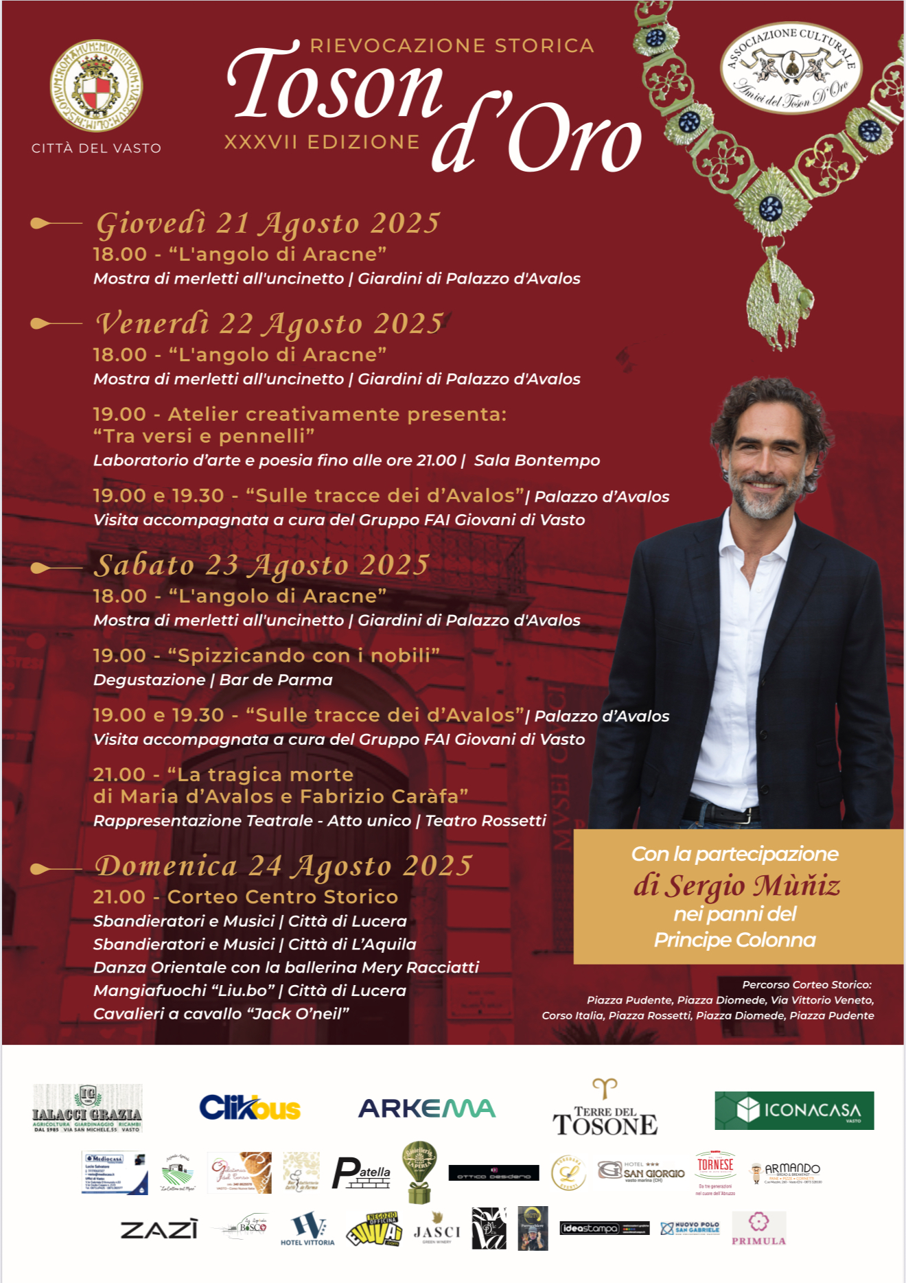 «La rievocazione storica del conferimento del Collare del Toson d’Oro da parte del Marchese del Vasto, Cesare Michelangelo D’Avalos, al Principe romano Fabrizio Colonna, quest’anno interpretato dall’attore spagnolo Sergio Múñiz torna – annunciano il sindaco Francesco Menna e l’assessore alla Cultura e al Turismo Nicola Della Gatta – ad animare le vie del centro. Il corteo, con i figuranti nei panni dei nobili, accoglie l’arrivo del Principe Colonna, ultimo a uscire dal Palazzo D’Avalos su una carrozza trainata da cavalli, e si conclude con il rientro nello stesso Palazzo per la cerimonia della Collazione, che riprende il rituale dell’Ordine del Toson d’Oro e culmina con il conferimento dell’onorificenza. La cittadinanza è invitata a parteciapare».
