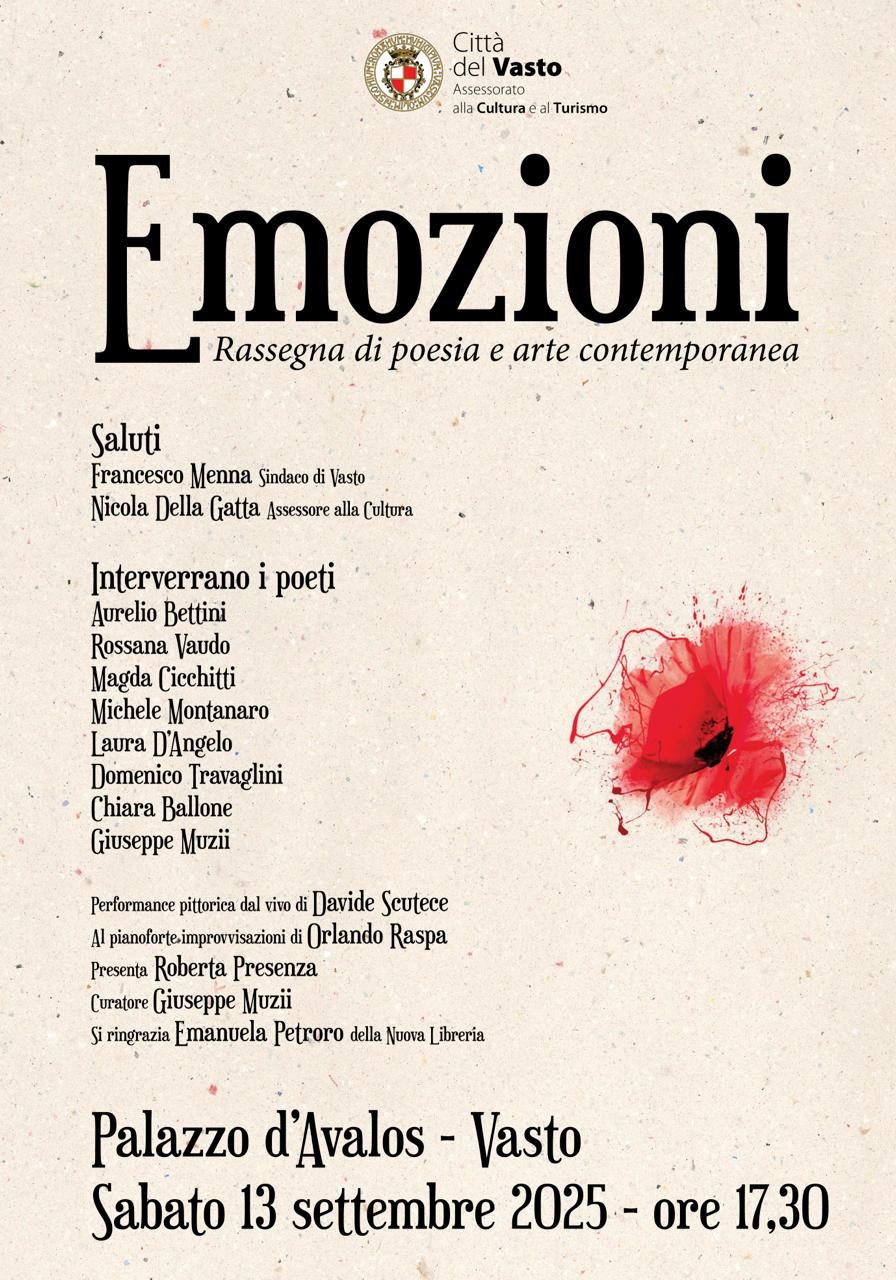 Il 13 settembre 2025, dalle 17:30, Palazzo d'Avalos a Vasto ospita "Emozioni - Rassegna di poesia e arte contemporanea”. L’evento sarà aperto dai saluti istituzionali del sindaco Francesco Menna e dell'assessore alla Cultura e al Turismo Nicola Della Gatta. Interverranno i poeti Aurelio Bettini, Rossana Vaudo, Magda Cicchitti, Michele Montanaro, Laura D'Angelo, Domenico Travaglini, Chiara Ballone e Giuseppe Muzii (curatore della rassegna). L'evento, presentato da Roberta Presenza, vedrà la performance pittorica dal vivo di Davide Scutece e le improvvisazioni al pianoforte di Orlando Raspa.