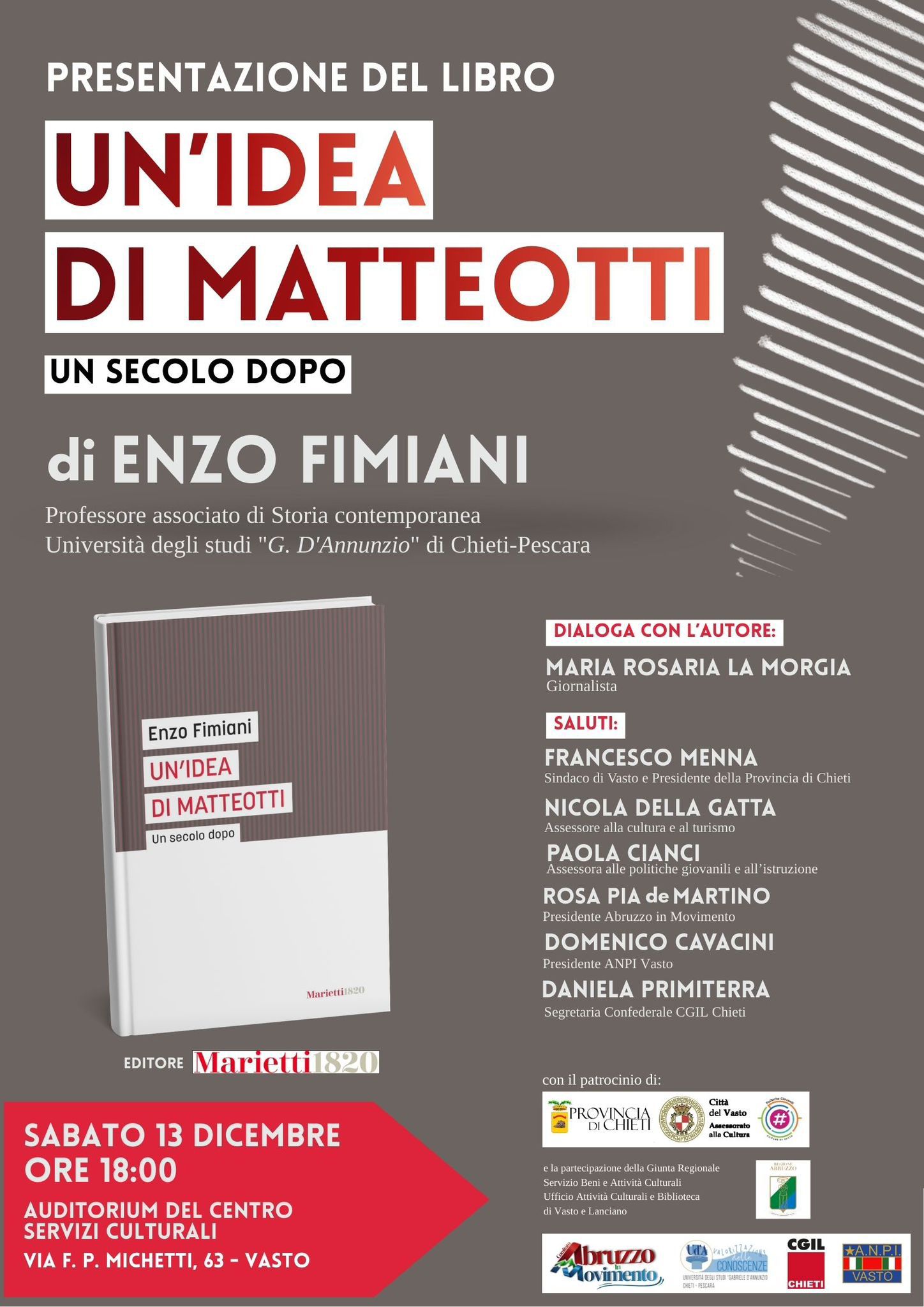 Domani sabato 13 dicembre alle ore 18, presso l'Auditorium del Centro Servizi Culturali in Via Michetti n.63, a Vasto si svolgerà la presentazione del libro “Un’idea di Matteotti un secolo dopo”, scritto da Enzo Fimiani, Professore associato di Storia contemporanea presso l’Università degli Studi “G. D’Annunzio” di Chieti-Pescara.