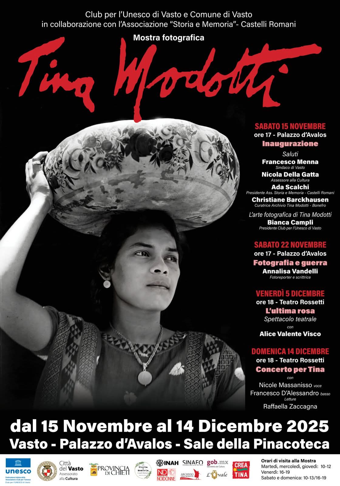 Sabato 15 novembre, alle ore 17:00, a Palazzo d’Avalos, l'inaugurazione con l’illustrazione dell’arte fotografica di Modotti a cura di Bianca Campli, storica d’arte, presidente del Club per l’Unesco di Vasto, il saluto della curatrice della mostra Ada Scalchi, presidente dell’associazione “Vita e Solidarietà- Castelli Romani” e della presidente dell’Archivio Tina Modotti di Bonefro, Christiane Barckhausen Canali. Sabato 22 novembre, alle ore 17:00, nella Sala Pinacoteca di Palazzo d’Avalos, conferenza su “Fotografia e guerra”, a cura di Annalisa Vandelli, fotoreporter, scrittrice e docente di fotogiornalismo. Venerdì 5 dicembre, alle ore 18:00, al Teatro Rossetti, spettacolo teatrale “L’ultima Rosa”, recitato e ideato da Alice Valente Visco. Domenica 14 dicembre, alle ore 18:00, al Teatro Rossetti, concerto per Tina, con Nicole Massanisso (voce), Francesco D’Alessandro (basso) e Raffaella Zaccagna (letture).