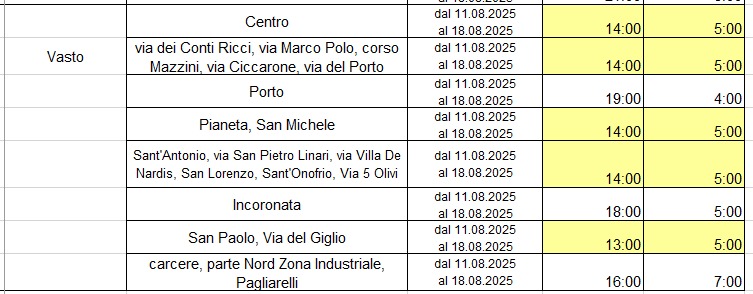 Al fine di evitare disservizio nella erogazione idrica, si rende necessario effettuare le chiusure programmate, come di seguito indicato in allegato (con indicazione di comune, zona e orari) fino a lunedì 18.08.2025, salvo diversa disposizione.